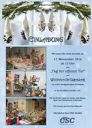 Wir laden Sie recht herzlich am 17. November 20l6 ab 12 Uhr zum Tag der offenen Tür wieder mit tollen handgefertigten Produkten in die Nordhäuser Straße 1 ein.Für die Kinder haben wir wieder viele Bastel Spiel- und Malstationen vorbereitet.
