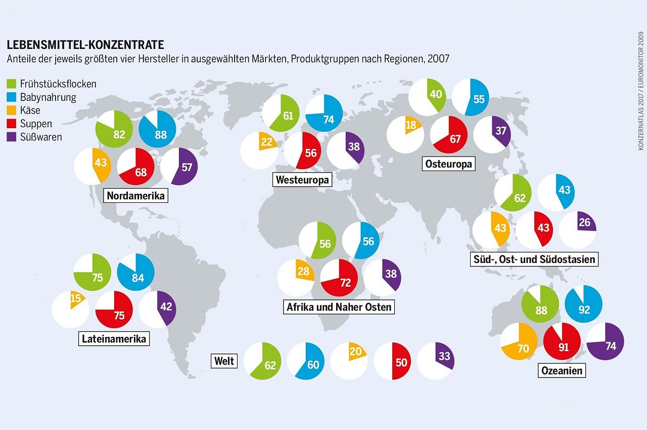 Wegen der vielen regionalen Hersteller ist der Weltmarkt für verarbeitete Lebensmittel noch nicht so stark konzentriert wie der Handel mit Agrarrohstoffen, Saatgut oder Pestiziden. Die 50 größten Lebensmittelkonzerne erwirtschaften 50 Prozent des weltweiten Umsatzes in der Branche; dabei verzeichnen die größten Konzerne die meisten Zuwächse. Diese Entwicklung wird sich so fortsetzen. Mit der Globalisierung der Ernährungssysteme und der Expansion der Multis mit ihrer Vielzahl von Produkten verändern sich die Essgewohnheiten, nicht nur im Norden, sondern auch in Schwellen- und Entwicklungsländern. Die wenig verarbeiteten Lebensmittel werden durch hochgradig verarbeitete ersetzt, auch durch Fertiggerichte wie Pizzen, Suppen und Menüs.