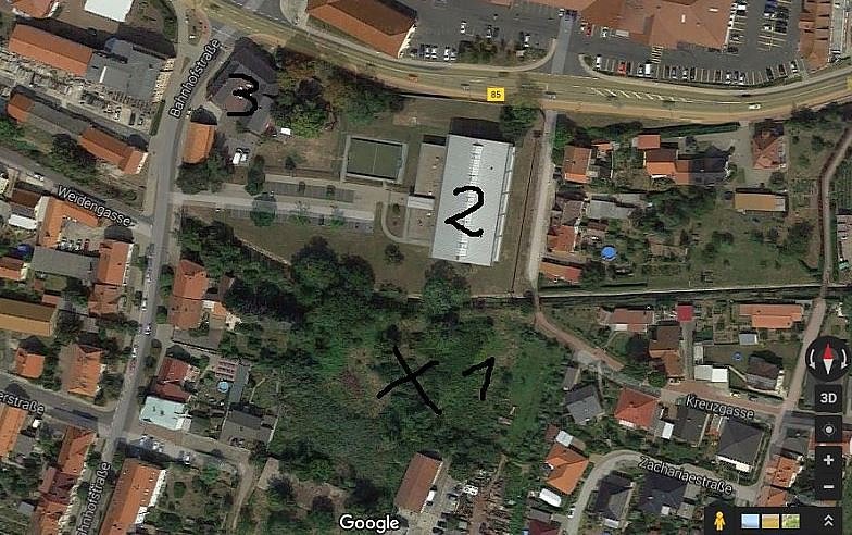 Neuer Standort in Bad Frankenhausen wird die Freifläche (1) nahe der Zweifelder Halle (2) und dem Domizil (3) sein. Mit im Bau vorgesehen ist der Bau einer Fußgängerbrücke über den Flutgraben. (Foto: Google Maps)