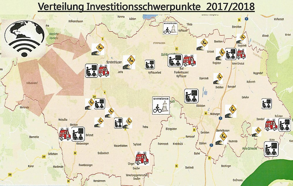 Ein Blick auf die Karte des Kyffhäuserkreises (Quelle Landratsamt) zeigt recht schnell warum: Größere Investitionen fließen nicht in die flächenmäßig große Gemeinde Helbedündorf.