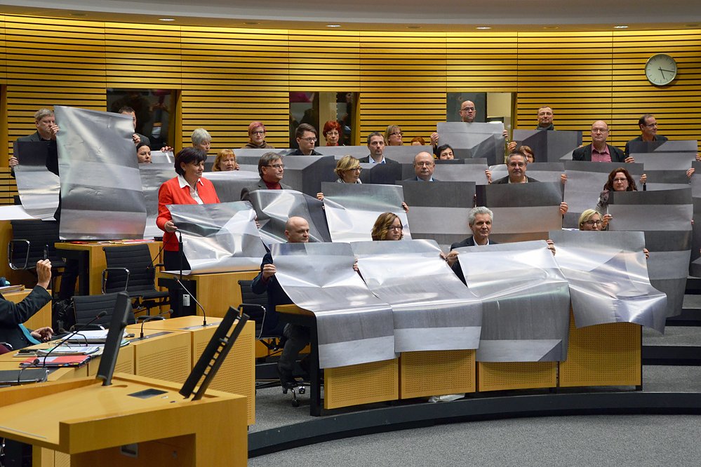 Die Abgeordneten der Fraktionen DIE LINKE, SPD, BÜNDNIS 90/DIE GRÜNEN und CDU zeigten am Mittwoch kurz vor Beginn der regulären Landtagssitzung mit Plakaten stilisierter Stelen das Berliner Holocaust-Mahnmal...