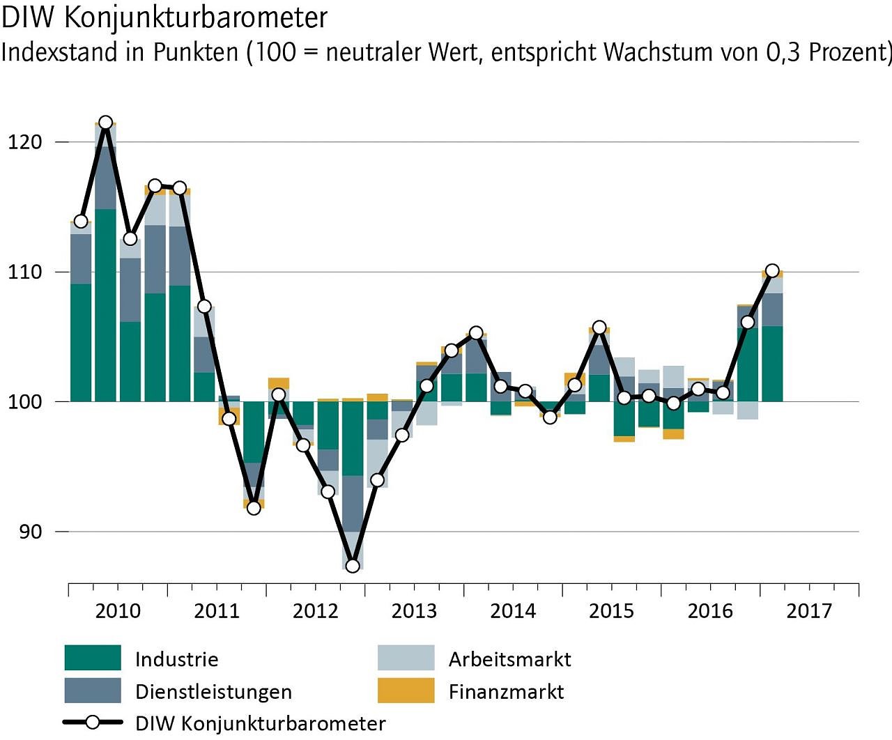 Insgesamt wird das Bruttoinlandsprodukt im vierten Quartal 2016 wohl 0,5 Prozent höher als im Vorquartal ausgefallen sein, und die Zuwachsrate dürfte sich im ersten Quartal 2017 auf 0,6 Prozent beschleunigen.