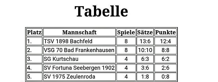 Autor: khhDurch eine starke Mannschaftsleistung sicherten sie sich momentan den zweiten Platz der Tabelle. Zweimal haben unsere Frauen souverän gegen Zeulenroda gewonnen. Im Spiel gegen den Neueinsteiger Seebergen wurde ein Spiel gewonnen und eins verloren. Damit gab es 6 von 8 möglichen Punkten.
