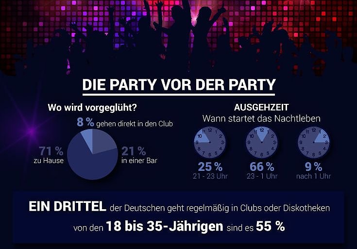 Deutschland ist eine Feier-Nation. Für einen Großteil der Bevölkerung gehört das Ausgehen zum allwöchentlichen Ritual dazu. Ein Drittel der Deutschen geht regelmäßig in Clubs oder Diskotheken. Bei den 18 bis 35-Jährigen sind es sogar 55 Prozent, die in der Woche ein bis zwei Mal ausgehen.