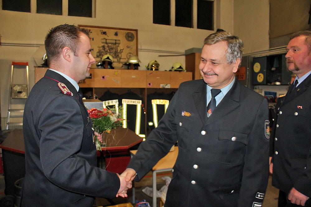 Dann wurde bei der FFW Stocksen gewählt. Alter und neuer Wehrleiter ist Mike Grambs, der hier die Glückwünsche von Manfred Kucksch entgegen nahm.