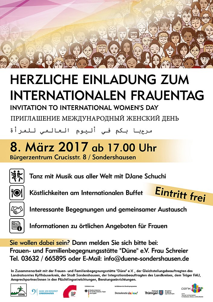 Dabei sollen alle Frauen mitgenommen werden, die in Deutschland leben und so laden die Frauen- und Familienbegegnungsstätte Düne e. V., Frau Schreier, sowie die Gleichstellungsbeauftragten des Landratsamtes des Kyffhäuserkreises, Frau Töppe, und der Stadt Sondershausen, Frau Schmied, ganz herzlich zur Internationalen Frauentagsfeier ein.