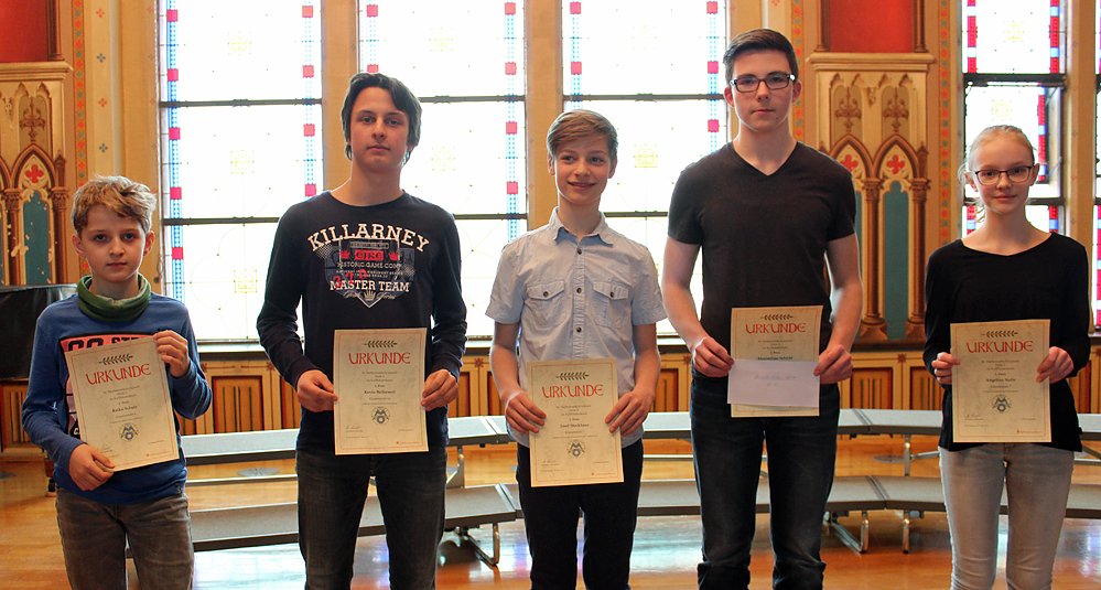 Besonders beglückwünscht wurde Raiko Scholz (6. Klasse), Josef Stockhaus, Rebecca Petri, Angelina Nolle, Maximilian Sebichtund Kevin Balßuweit (alle 7. Klasse) die so viele Punkte errangen, dass sie bei der Thüringer Landesolympiade teilnehmen durften. Für seine besonderen Lösungen erhielt Josef Stockhaus (Bildmitte) sogar eine Anerkennung.