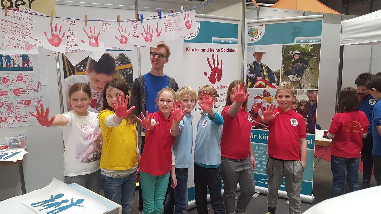 Ihren Auftritt auf der Messe Kinderkult nutzte das Thüringer Jugendrotkreuz (JRK) und setzte mit zahlreichen Kindern und Jugendlichen ein Zeichen gegen den Einsatz von Kindersoldaten. Damit fiel zugleich der Startschuss für die Aktion Rote Hand....