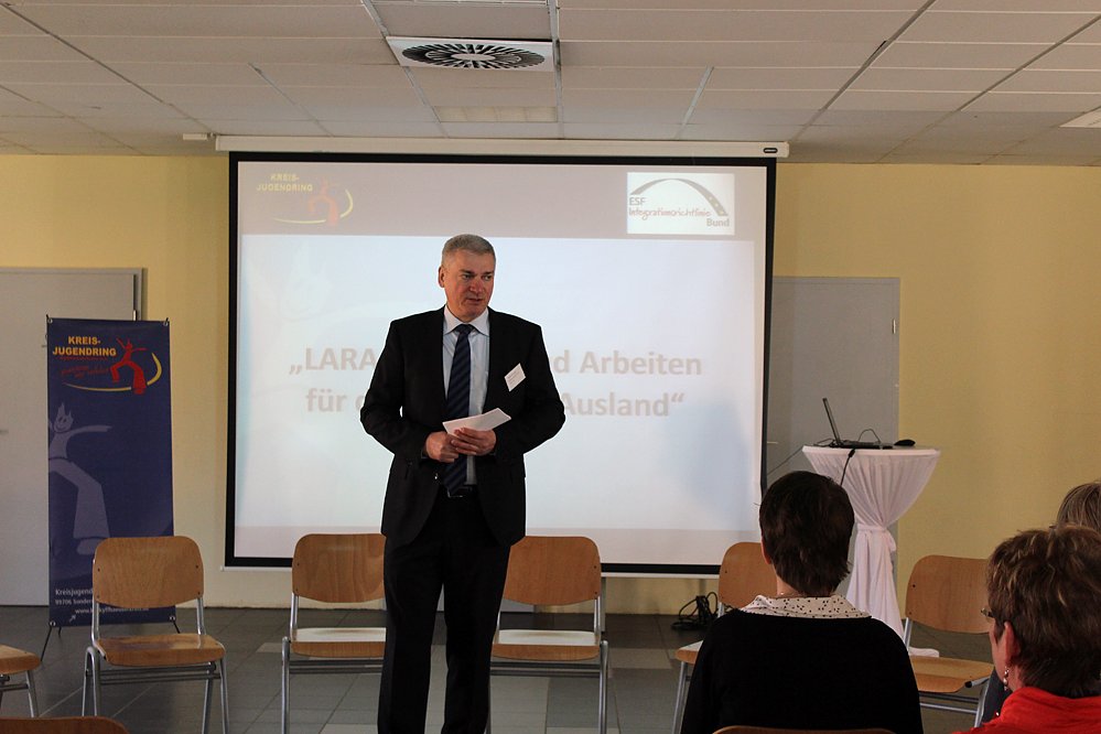 Thomas Schabestiel Projektleiter Projekt LARA Lernen und Arbeiten für die Region im Ausland übernahm die Begrüßung. Unter den Gästen Vertreter des Sondershäuser Bildungsverein e.V. und der VHS Bildungswerk GmbH/ Zweigniederlassung Thüringen, sowie die Geschäftsführerin des Kreisjugendrings, Christian Zyber.