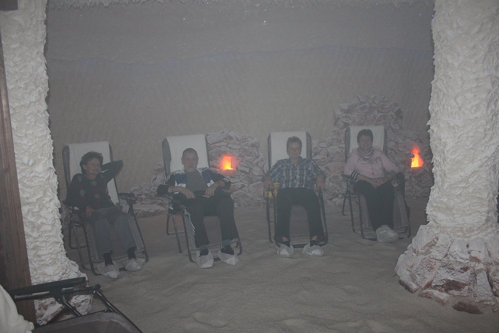 Aber etwas zeichnet die Salzgrotte in der Kyffhäuser Therme gegen über anderen Salzgrotten aus: Zusätzlich wird die Salzgrotte mit der 5- prozentigen Sole aus der ortseigenen zertifizierten Heilquelle vernebelt. Dadurch herrscht eine Luftfeuchtigkeit von max. 60% und eine Raumtemperatur von ca. 22°. Im Normalfall bemerkt man diese Heilnebel gar nicht so richtig. Wer aber, wie kn am Gesundheitstag, den Blitz an der Kamera einsetzt, bemerkt, dass das Bild leicht milchig wird. Das Blitzlicht reflektiert an den vielen kleinen vernebelten Tropfen und machen ihn so sichtbar, den Heilnebel, den man sonst nur an seiner Wirkung auf die Atemwege langfristig bemerkt.