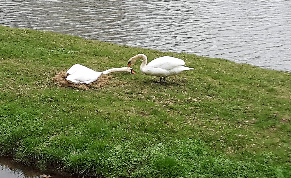 Dieser neue Bauplatz des Schwanenpaars ist gut gewählt. Zwischen Mühlwipper und kleinem Parkteich kommt man sich wenigstens nicht mit den Spaziergängern ins Gehege. Schwäne können bei der Brut recht angriffslustig sein.