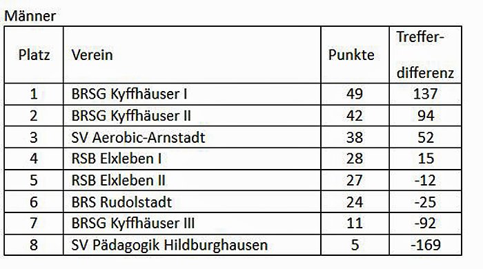 Bei den Männern konnten sich die Mannschaften vom Kyffhäuser, aus Arnstadt und aus Elxleben in der oberen Tabellenhälfte festsetzen. In der Endabrechnung holte dann doch deutlich mit nur zwei Niederlagen und drei Unentschieden aus insgesamt 28 Spielen die BRSG Kyffhäuser I (Frank Etzel, Eckart Piontkowski, Martin Kropka, Marita Löwnich als Mannschaftsführer) den Titel, gefolgt von der BRSG Kyffhäuser II (Dieter Grabe, Gundolf Heyne, Karl-Heinz Schmid, Volker Stietzel) und SV Aerobic Arnstadt. Damit ging der Titel zum sechsten Mal in Folge an eine Mannschaft vom Kyffhäuser.
