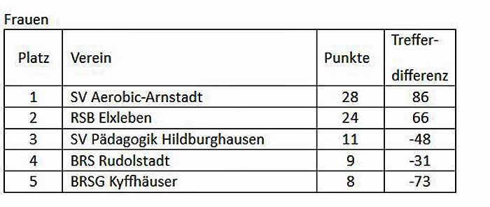 Bei den Frauen war es an der Tabellenspitze das gesamte Jahr über ein Zweikampf zwischen RSB Elxleben und SV Aerobic Arnstadt. Beide dominierten die Saison in Thüringen. Letztendlich entschieden die direkten Spiele gegeneinander. Die Arnstädterinnen gewannen dreimal und die Elxleberinnen einmal. Somit wurde SV Aerobic Arnstadt Thüringenmeister.