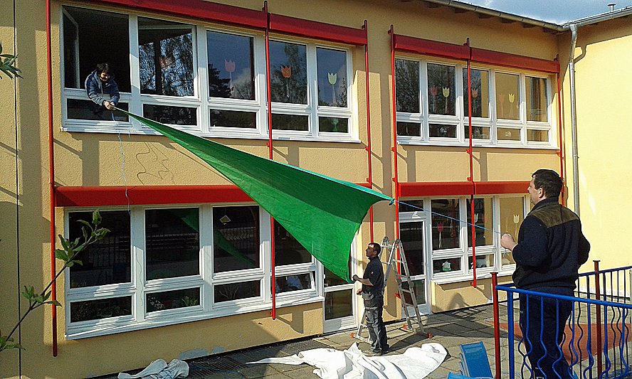 Das Indianerdorf und der Krippen-Spielplatz wurden vom Laub befreit und für die Kinder schick gemacht. Die Terrassen wurden mit bunten Sonnensegeln überspannt und mit zahlreichen Stühlen und Tischen bestückt. Wenn nun noch das Wetter mitspielt, können sich die kleinen Helbespatzen ihr Frühstück bald auch endlich wieder im Freien schmecken lassen.