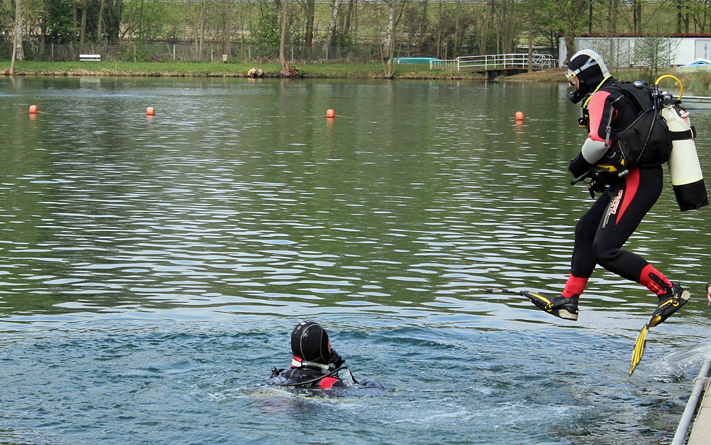 Trotzdem waren rund 20 Schwimmerinnen und Schwimmer die teils auch später im Wasser waren. Die beiden Taucher vom Tauchsportclub "Delphin" zogen es, vor im Neoprenanzug ins Wasser zu gehen.