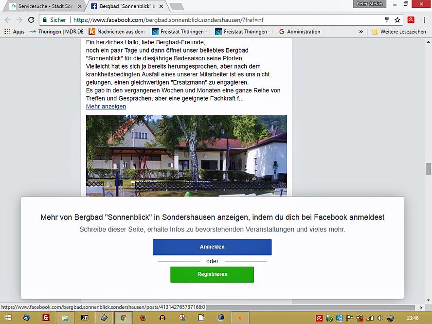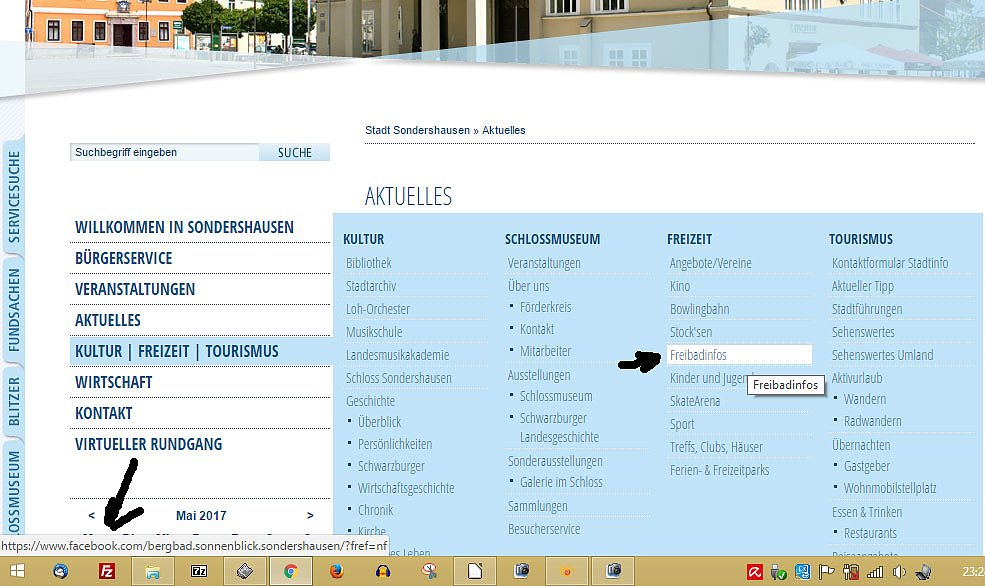 Auf der Webseite der Stadt Sondershausen gab es doch immer eine Freibadinformation. Gesagt getan und oh Schreck, wenn man auf Freibadinformation klickt wird man siehe unten links auf eine Facebookseite verlinkt. Ihnen schwant schon etwas?