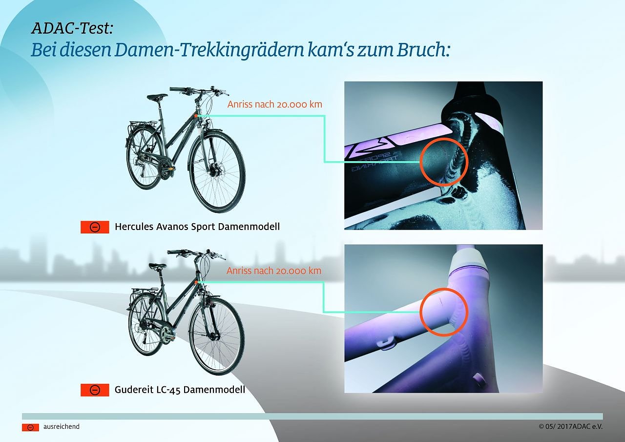 Mit einem mangelhaft durchgefallen sind die Herrenräder Gudereit LC-45 und Pegasus Opero SL – der Bruch jeweils an der Schweißnaht zwischen Steuer und Ober- bzw. Unterrohr stellt ein erhebliches Sicherheitsrisiko dar. Bei den Damenrädern entfällt die schlechteste Bewertung (gerade noch ausreichend) auf das Modell Gudereit LC-45. Auch hier bemängelten die Prüfer einen Anriss im Rahmen nach den Haltbarkeitsversuchen.