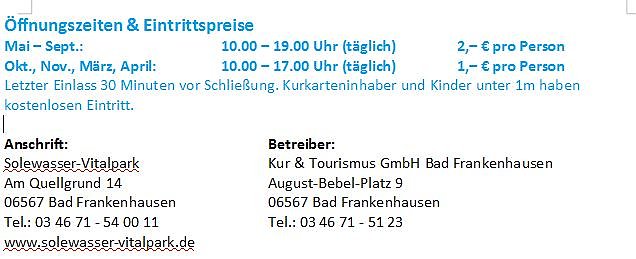 Neu in diesem Jahr ist der Verleih von Sonnenliegen- und Schirmen sowie der des Minigolf-Zubehörs. Auch der Fahrrad- und E-Bike-Verleih ist von der Kyffhäuser-Therme in den Vitalpark gezogen, zwei Boccia-Spiele und den Grillschlüssel für die Benutzung des Grills im Stadtpark kann man ab dieser Saison ebenfalls an der Kasse vom Solewasser-Vitalpark ausleihen.