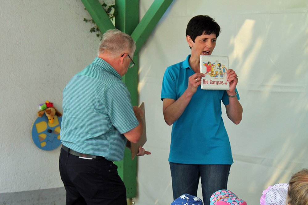 Die Kindervilla-Kinder konnten zur Verleihung in ihrem grünen Gruppenraum viele Gäste begrüßen, nicht nur Eltern und Großeltern sind gekommen, sondern auch der Bürgermeister Matthias Strejc als Träger der Einrichtung, Dorothea Lehmann als Vorsitzende des Fördervereins und auch der Frankenhäuser Frauenchor. Natürlich wurden die Gäste musikalisch begrüßt und die Kinder gaben einen kurzen Einblick in ihr Können. Das Solelied wurde sogar gemeinsam mit dem Frauenchor gesungen.