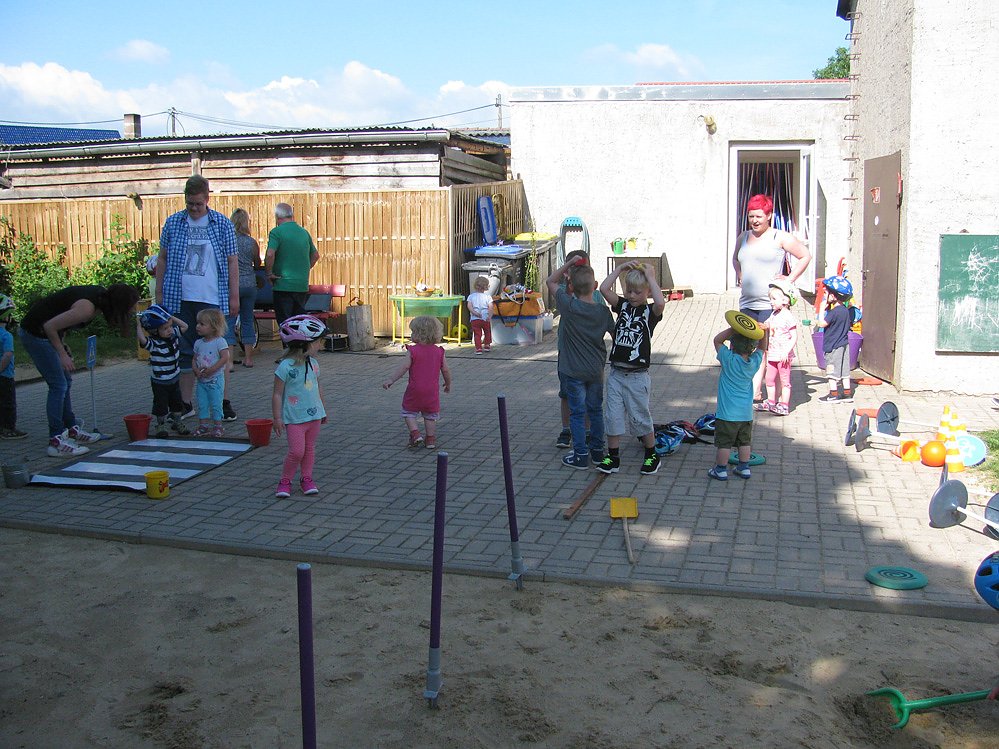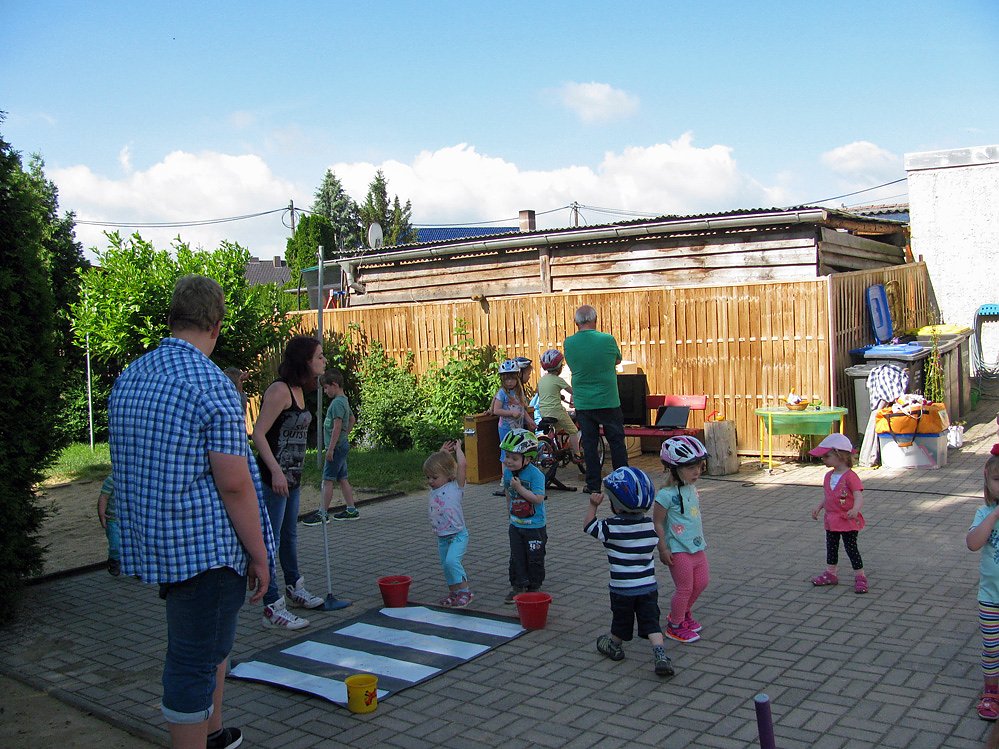 Weitere Stationen beschäftigten sich mit Bewegung und Gleichgewicht, wo durch die Kinder verschiedene Aufgaben zu lösen waren, die wichtig für sicheres Verhalten im Straßenverkehr sind. So unter anderen Eierlaufen über eine Wippe, transportieren eines Balancesäckchens auf dem Kopf durch verschiedene Hindernisse.
