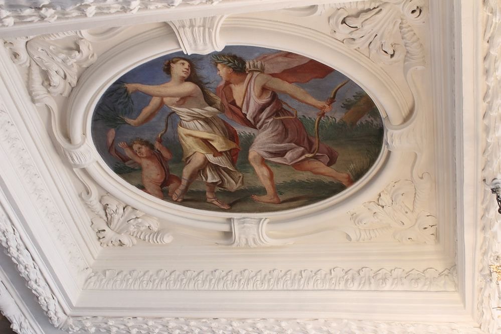 Um was geht es? Im Tanzspiel nach barocker Art geht es um die griechische Myhologie, um die Liebe von Daphne und Apollon, hier als Deckengemälde im Riesensaal. Es geht um ein junges Mädchen und die Verse des Ovids. Anlassfür das Thema ist der 2.000 Todestag des römischen Dichters Ovid und des 800 jährigen Jubiläums der Übersetzung seiner Methamorphosen durch Albrecht von Halberstadt im Kloster Jechaburg zu Sondershausen (um 1217).