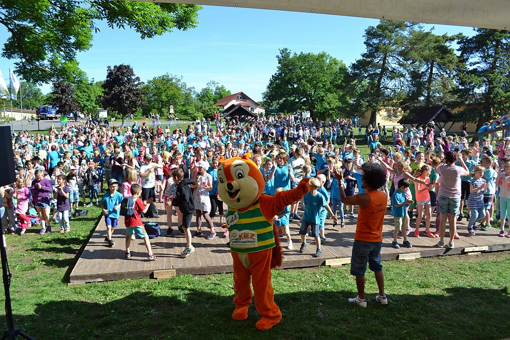 Über 30 Freizeitaktivitäten hatten die Mitarbeiter der Feuerkuppe für die Kinder vorbereitet. Eröffnet wurde das Fest mit viel Musik und natürlich durfte auch das Maskottchen Eddi nicht fehlen. Eddi sorgte auf der Bühne mit den Kindern für super Stimmung. Für die Lehrer gab es Kaffee und Kuchen im eingerichteten Lehrercafé.