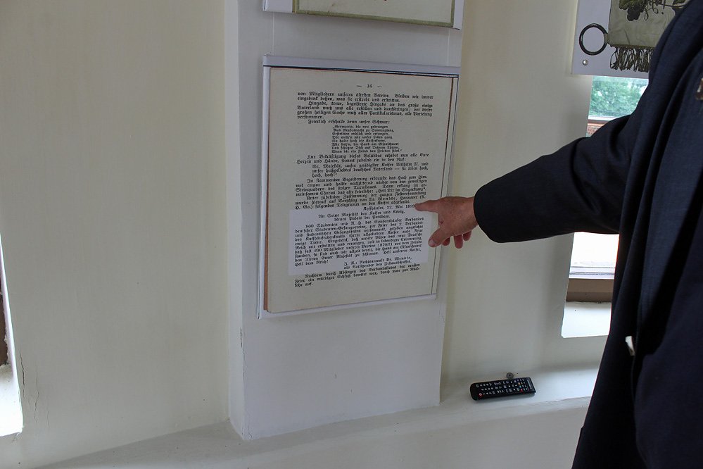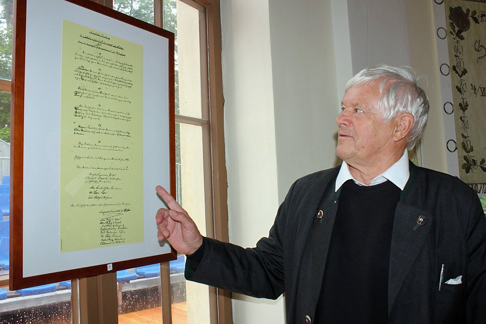 Dr. Peter A. Reiser vom SV verweist stolz auf die ausgestellte Kopie des Kartellvertrages, die in der Sonderausstellung zu sehen ist. Dr Reiser bezeichnete sie als den Höhepunkt der Ausstellung.