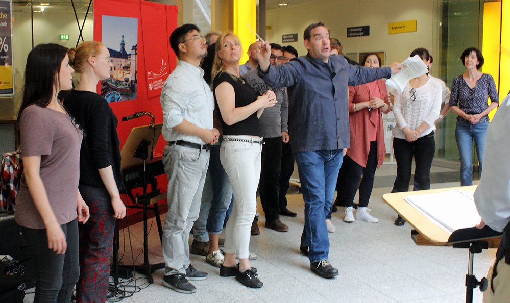 Auf dem Programm stand heute Chorprobe. Wie sich das für das Stück gehört, wurde nicht mit einem Taktstock dirigiert. Chordirigent Markus Popp hatte zum Zimmermansbleistift gegriffen und siehe da, die Sängerinnen und Sänger haben auch darauf gehört.