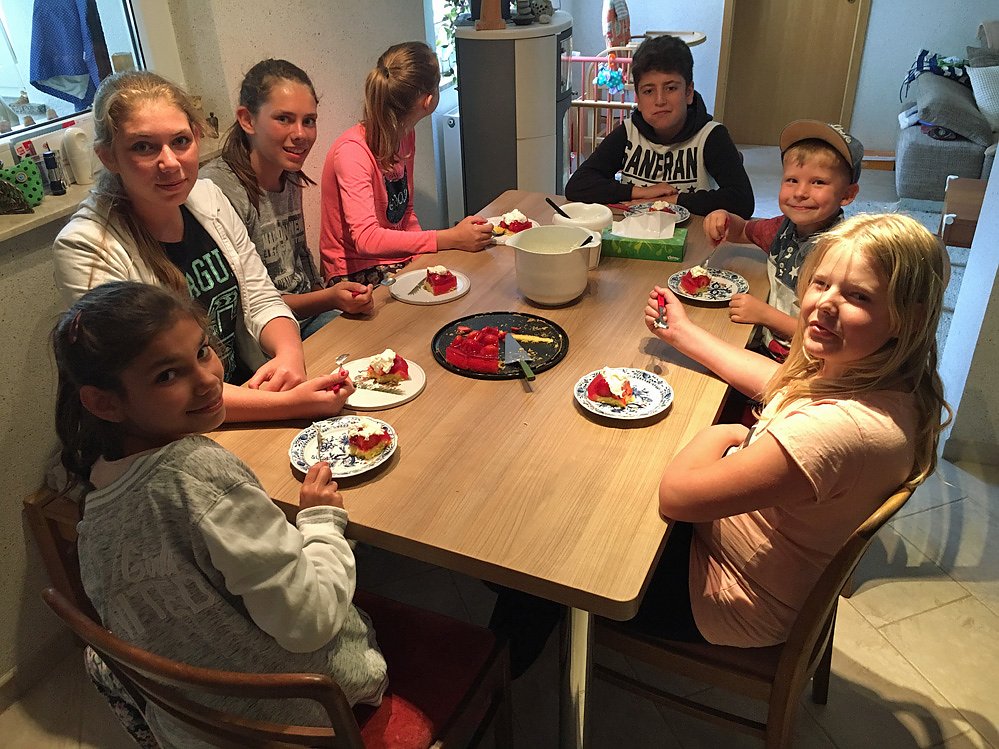 Bei einem leckeren, selbstgebackenen Stück Erdbeerkuchen, mit Beeren aus dem heimischen Garten, erfuhren wir etwas über die frisch geschlüpften Küken, die wir anschließend anschauen und füttern duften.