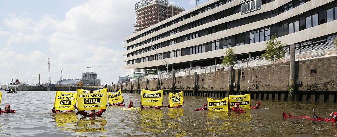 Für konsequenten Klimaschutz demonstrieren Greenpeace-Mitarbeiter heute auf der Elbe während einem Auftritt von Bundeskanzlerin Angela Merkel (CDU) in der Hafencity Universität. Über 100 Mitarbeiter der Umweltschutzorganisation forderten auf einem Floß, in sechs Schlauchbooten und als Schwimmer im Wasser mit Bannern...