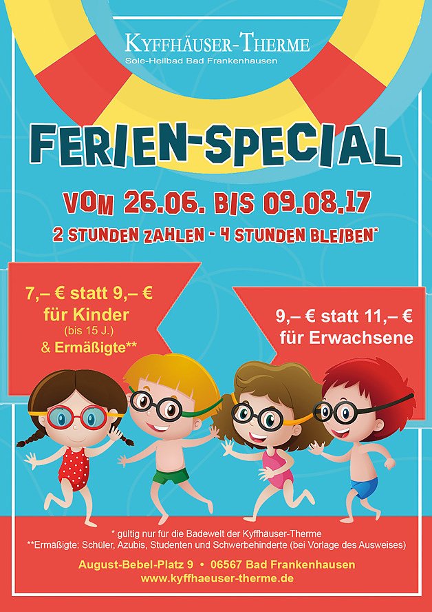 Pünktlich zum Ferienstart in Thüringen hält die Kyffhäuser-Therme wieder attraktive Rabatte bereit. Mit dem beliebten Ferien-Spezialtarif für die Badewelt gilt: "2 Stunden zahlen & 4 Stunden bleiben!".