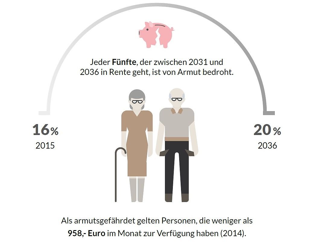 2036 von 16 auf fast 28 Prozent. Damit ist das Risiko zur Altersarmut bei alleinstehenden Frauen rund viermal so hoch wie im Durchschnitt (7 Prozent). Bei Langzeitarbeitslosen steigt die Grundsicherungsquote von rund 19 auf 22 Prozent, bei Menschen ohne Berufsausbildung von 10 auf 14 Prozent. Auch zwischen Ost-und West gibt es starke Unterschiede.