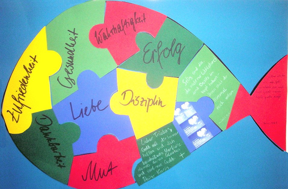 Wir hatten für Tristan ein Plakat gebastelt, auf dem aus verschiedenen farbigen Puzzle-Teilen ein Fisch zusammen gesetzt wurde. Der Fisch ist das älteste Erkennungszeichen der christlichen Gemeinde er heißt auf griechisch Ichthys die Buchstaben dieses Wortes sind die griechischen Anfangsbuchstaben von Jesus Christus Gottes Sohn Retter.