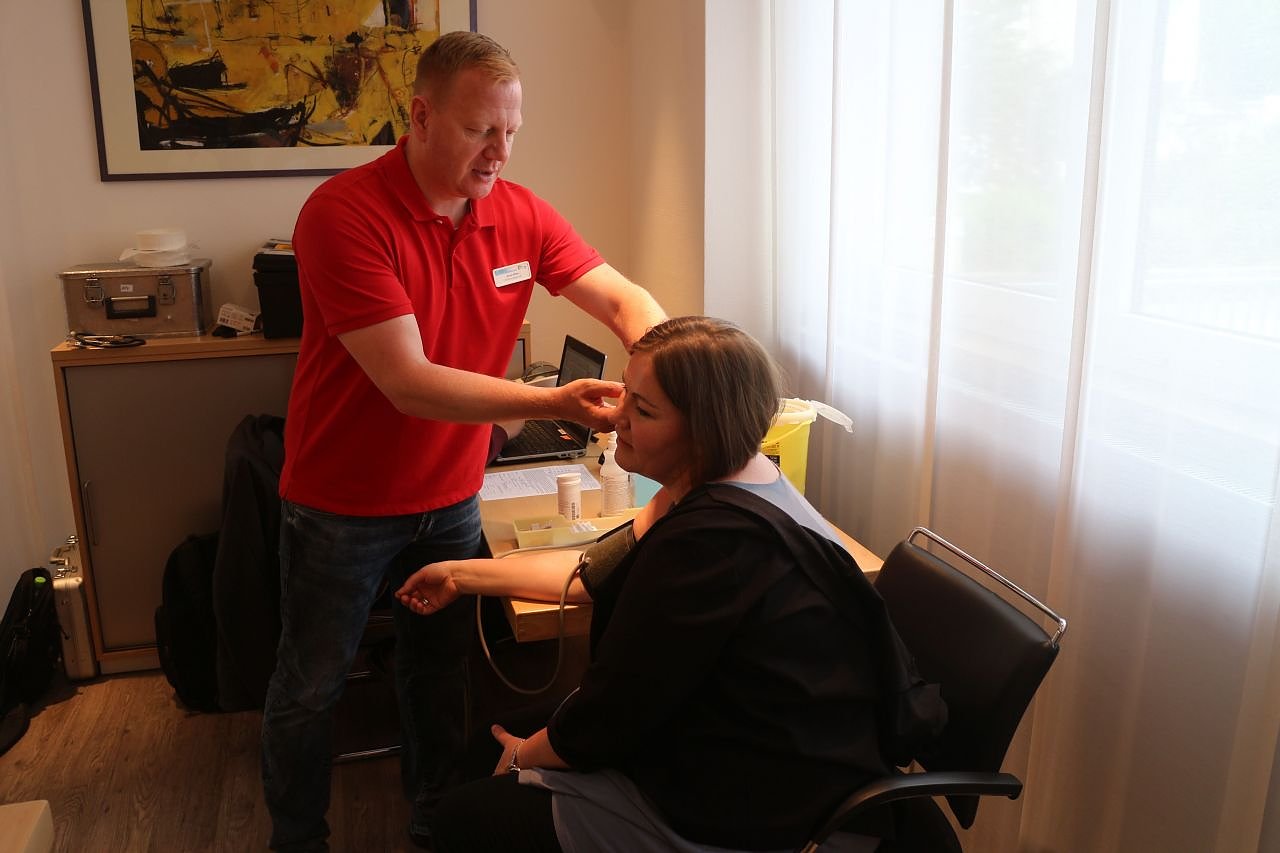 Frau Karch spendet seit 15 Jahren Blut, heute ganz bequem vom Arbeitsplatz aus (Foto: Angelo Glashagel)