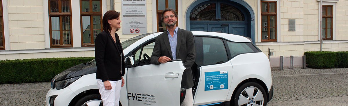 Einer der Partner bei der Erarbeitung des Konzepts ist Prof. Dr. Matthias Gather, Fachhochschule Erfurt, Institut für Verkehr und Raum, der eigens mit einem BMW-Mobil aus Erfurt zum Pressegespräch gekommen war und hier zusammen mit Landrätin Antje Hochwind das Fahrzeug vor dem Landratsamt präsentierte.