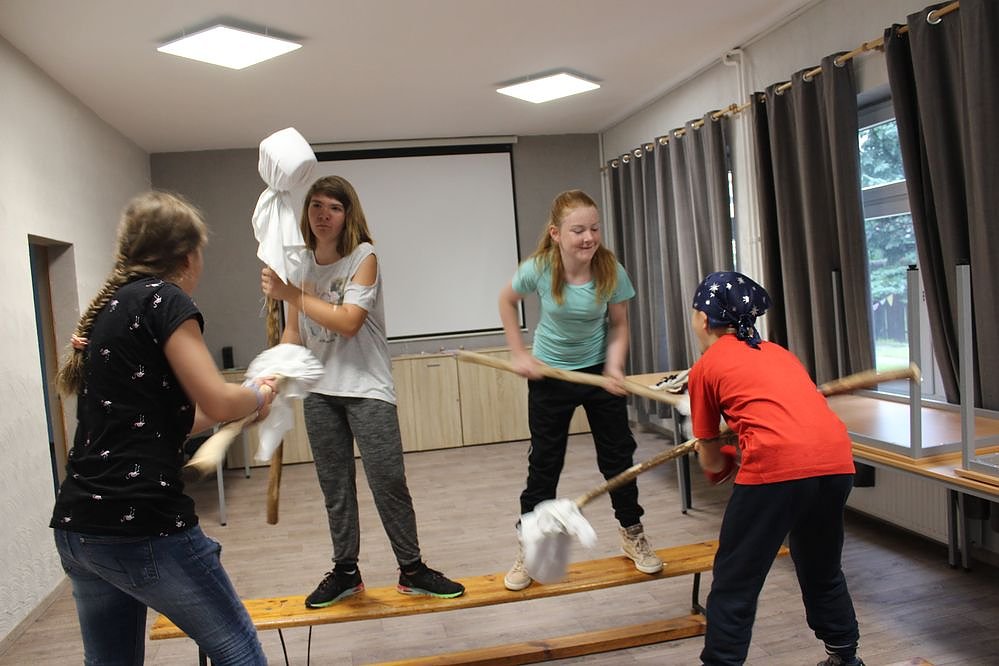Seit Montag ist das Thema Piraten der Schwerpunkt in den Ferien des Haus der Jugends. Hier wurde schon mal geübt, wie man seinen Gegner mit Hilfe der Keulen von der Bank befördert.