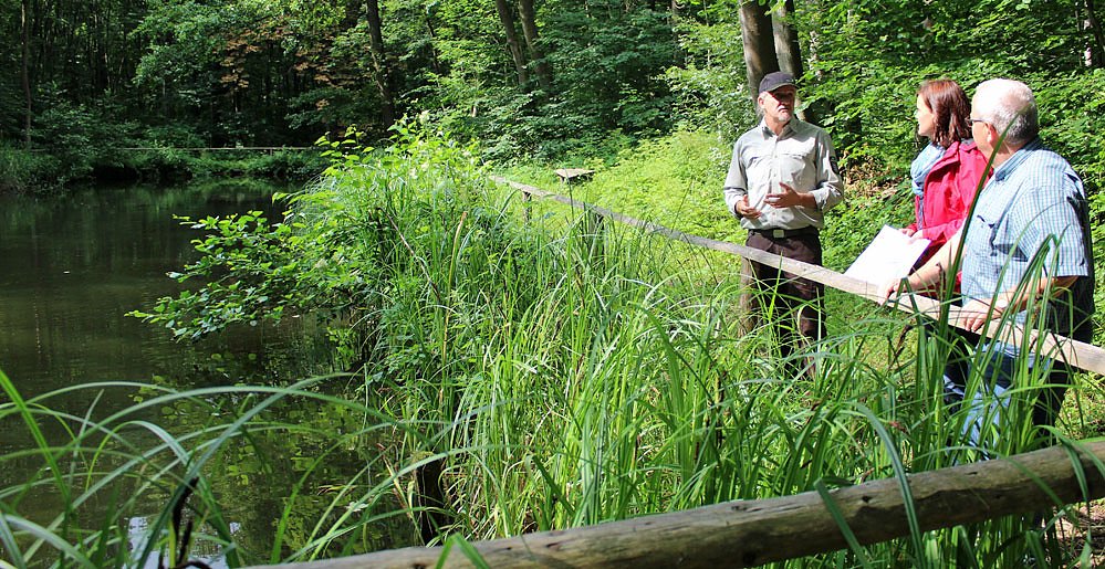 Hier erläutert Ralf Hubert der Landrätin, zusammen mit Verwaltungsleiter Dr. Heinz-Ulrich Thiele, dass der Forst diesen Bereich seit Jahren hegt. Ohne die Herausnahme von Bäumen würde der Teich zu stark beschattet und die Temperaturen für das Laichen, besonders der Geburtshelferkröte, zu gering sein. Ohne zu Tun des Menschen würde dieser Teich bald verlanden und als Laichgewässer wegfallen.
