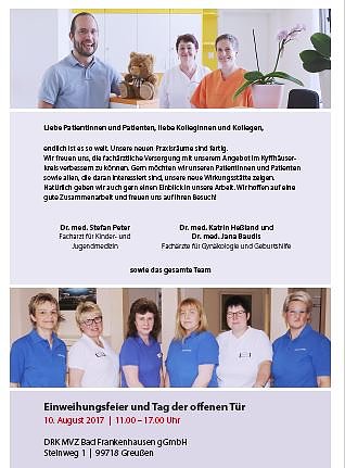 Autor: khhDie Einweihung der neuen Praxisräume des DRK Medizinischen Versorgungszentrums in Greußen Steinweg 1 findet am 10. August 2017 in der Zeit von 11:00 – 17:00 Uhr statt.