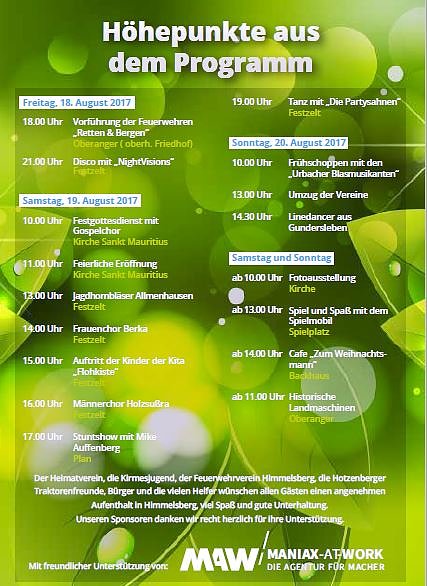 Bei unserem bunten Programm haben wir an alle Altersgruppen gedacht und werden Sie auch kulinarisch verwöhnen. Zum Umzug am Sonntag, bei dem der Alltag und Historisches von Himmelsberg dargestellt wird, werden wir tatkräftig von Vereinen und Gruppen