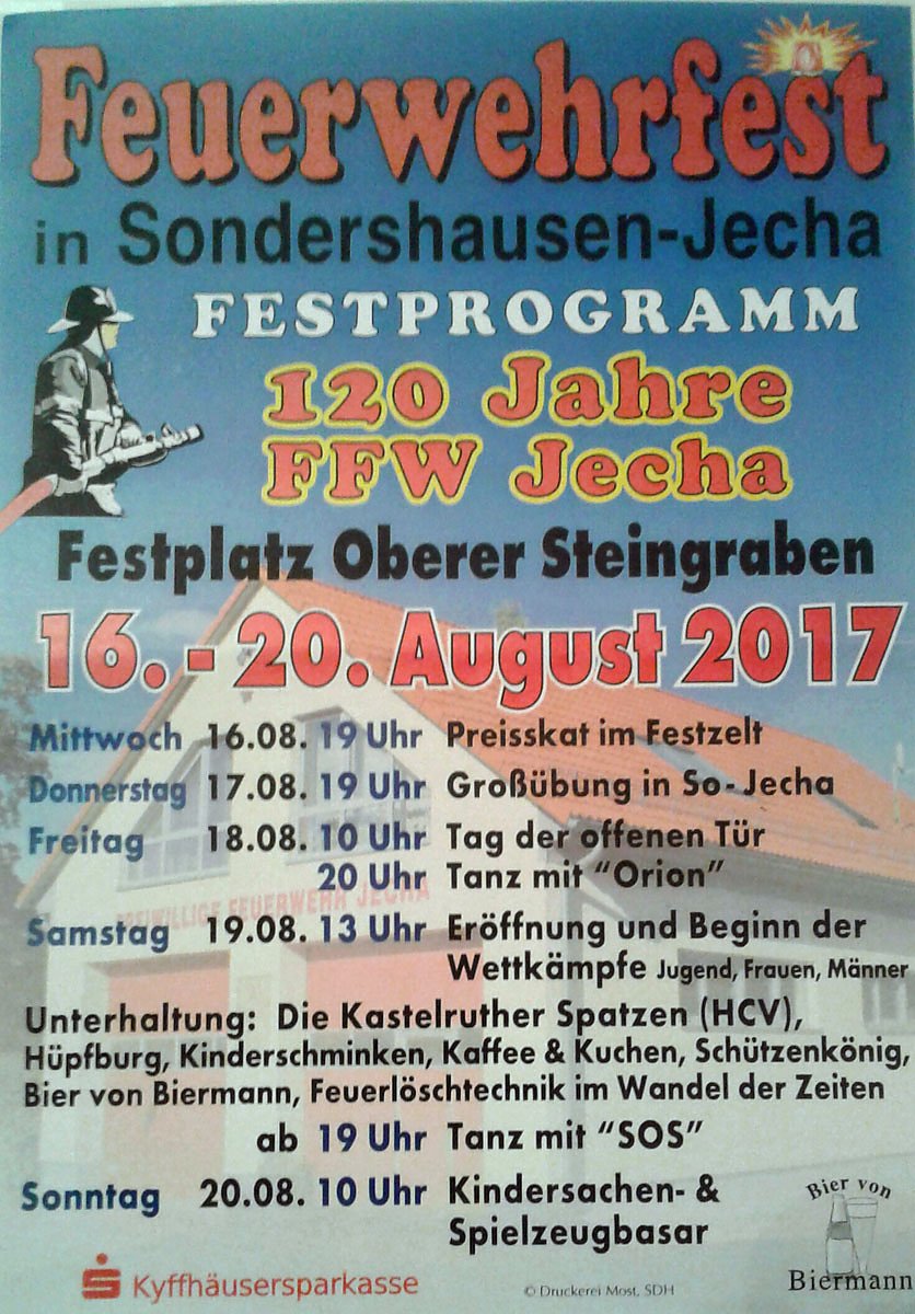 Die Feuerwehr Paul Volkmann Sondershausen Jecha und der Jechaer Feuerwehrverein laden dazu herzlich ein.