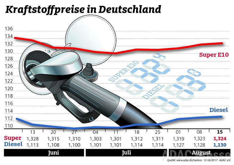 Der leichte Aufwärtstrend bei den Kraftstoffpreisen setzt sich trotz des gesunkenen Rohölpreises auch in dieser Woche fort. Autofahrer müssen laut ADAC für einen Liter Super E10 durchschnittlich 1,324 Euro und damit 0,1 Cent mehr als in der Vorwoche bezahlen. Der Dieselpreis kletterte um 0,2 Cent auf 1,130 Euro pro Liter...