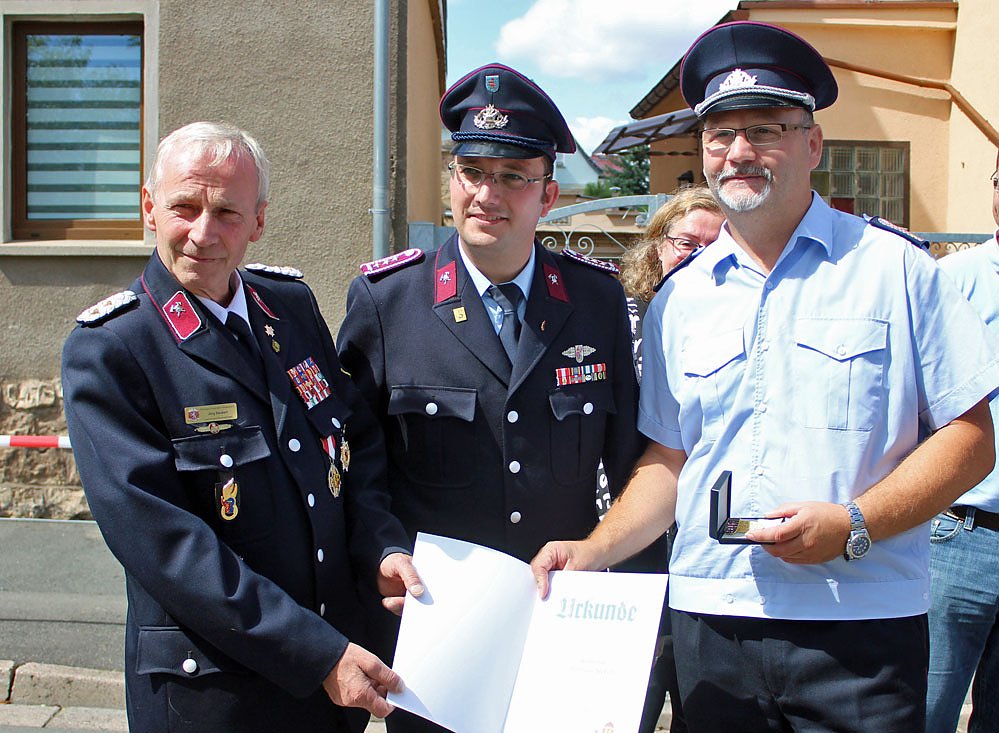 Thüringens Landesjugendwart Jörg Deubert (li.) hatte für Wehrleiter Matthias Sickel eine gesondere Ehrung mitgebracht, die er zusammen mit Kreisjugendwart Sebastian Thiersch übergab, die goldene Ehrenspange für die Würdigung der Jugendarbeit in der Wehr.