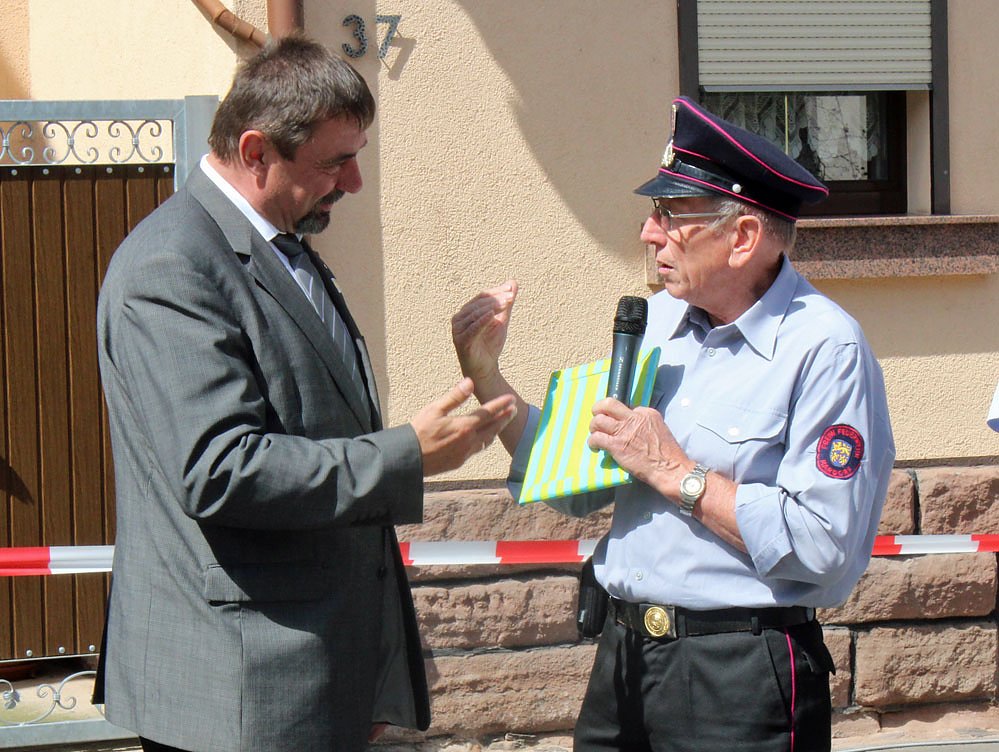 Nachdem Kreyer bereits die langjährige gemeinsame Patenarbeit mit der FFW Mardorf (Hessen) gewürdigt hatte, gab es von Helmut Reisse aus Mardorf ein kleines Abschiedsgeschenk für den Bürgermeister, weil sich die beiden in ihren Funktionen so wohl nicht mehr sehen werden. Für die Wehr hatte Reisse einen USB-Stick mit Bildern von der Ausbildung dabei.
