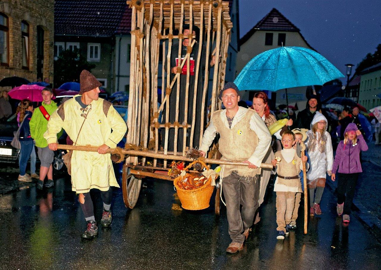 Autor: khhIn den zurückliegenden zwei Jahren war zum Umzug anlässlich des Bauernmarktes jeweils ein besonderer Höhepunkt zu sehen und vor allem auch zu hören: Thomas Müntzer, dargestellt von Roland Sölle, trug Passagen aus seiner Vita vor. Und dies von einem Wagen, der in seiner Gestalt viel von einer grünen Minna hat. Begleitet wurde er von zahlreichem Gefolge als Bauernfamilien, Fuhrknechten jedoch auch seinem Vollstrecker, dem Henker. Dieses Bild innerhalb des Umzuges dürfte sich eingeprägt haben.