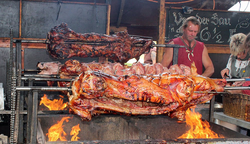 Während die Ritter in der Schlacht vor der Wasserburg natürlich in ihrem Schaukampf überlebten, konnte man es von diesen Schweinen nicht sagen. Die wurden glatt verspeist. Zu essen und trinken gab es ausreichend.