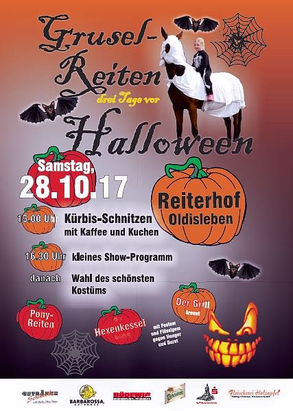 Auch dieses Jahr wieder veranstaltet der Reit- und Fahrverein Oldisleben e.V. eine Halloween Kinder- Party am 28. Oktober 2017 ab 15:00 Uhr auf dem Gelände des Vereins in Oldisleben neben der Mühle.