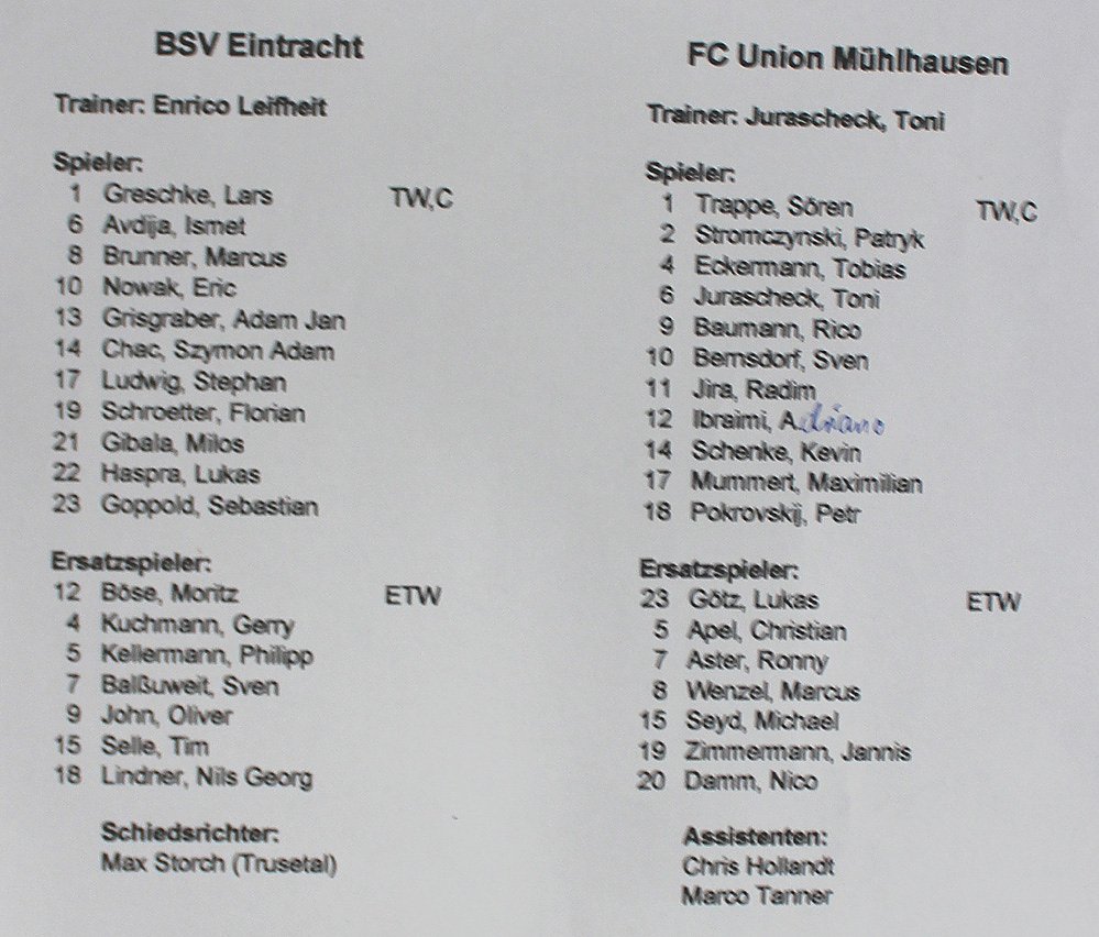 Fiel aber nicht und als sich bereits alles zur Halbzeit einrichtete, half ein Mühlhäuser der Eintracht und schob in der 2. Minute der Nachspielzeit den Ball ins eigene Tor. Der "Unglücksrabe" war Petr Prokrovskij.