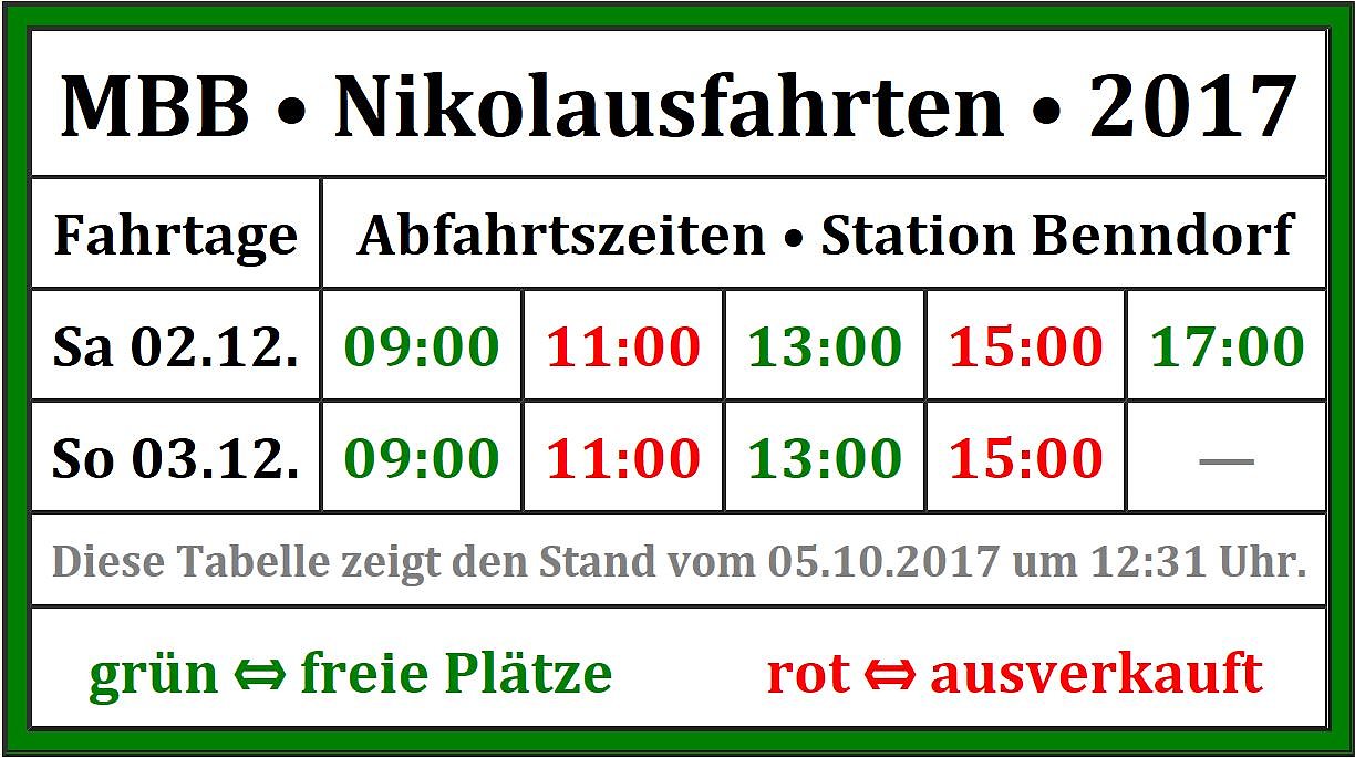 Der Vorverkauf für die Nikolausfahrten 2017 läuft bei der Mansfelder Bergwerksbahn weiter auf Hochtouren. Schon vier Züge sind komplett ausverkauft, auch bei anderen werden die Plätze bereits knapp. Interessenten sollten sich daher kurzfristig bei der Bergwerksbahn melden.