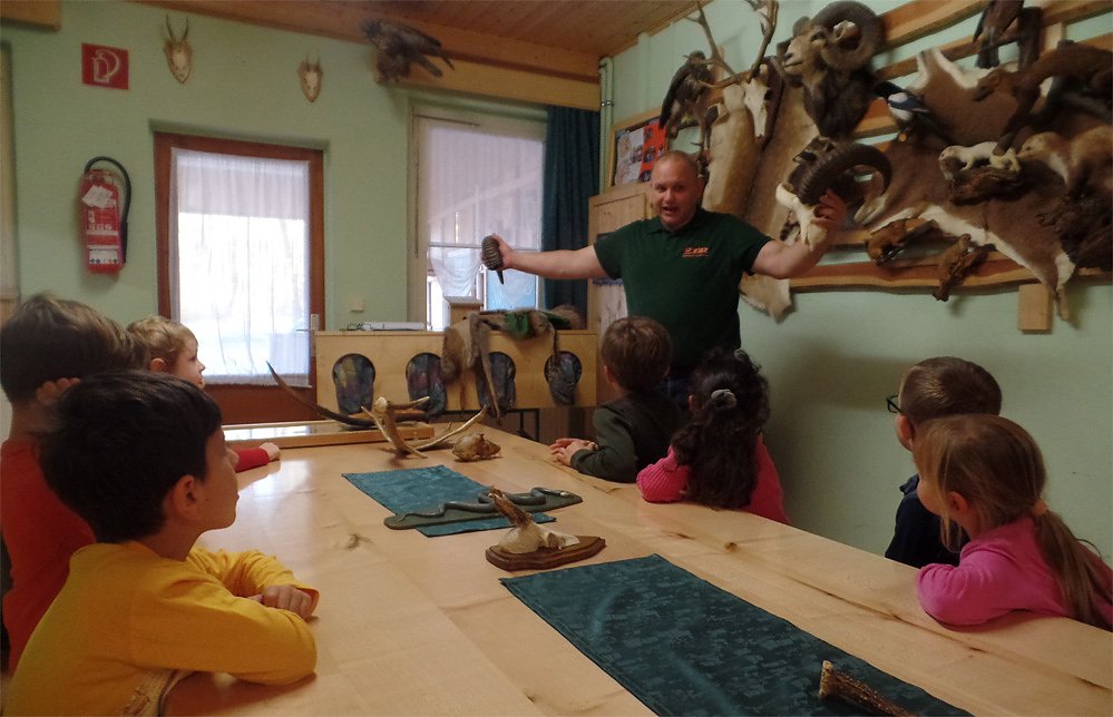 Darauf bekamen wir auch eine einleuchtende Antwort. Und warum wird der Eichelhäher als Waldpolizei bezeichnet? … all dies haben wir an diesem Vormittag erfahren. Tierpräparate vom Frettchen, Wiesel, Auerhahn, Waschbär, von der Wildkatze und Ente konnten bestaunt werden. Verschiedene Geweihe und Felle, ja sogar das Jagdhorn durften wir anfassen und ausprobieren. Zum Abschied bekamen wir Stundenpläne mit tollen Naturimpressionen und Informationen geschenkt. Auch einen eigenen Ansteckbutton bekam jedes Kind.