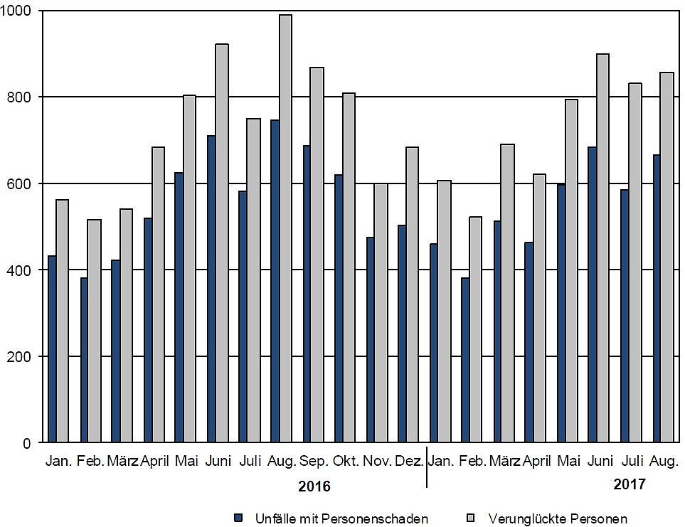 Weitere 844 Personen wurden bei Straßenverkehrsunfällen schwer oder leicht verletzt. Dies entspricht im Vergleich zum Vorjahresmonat einem Rückgang um 13,5 Prozent (132 Verletzte).
